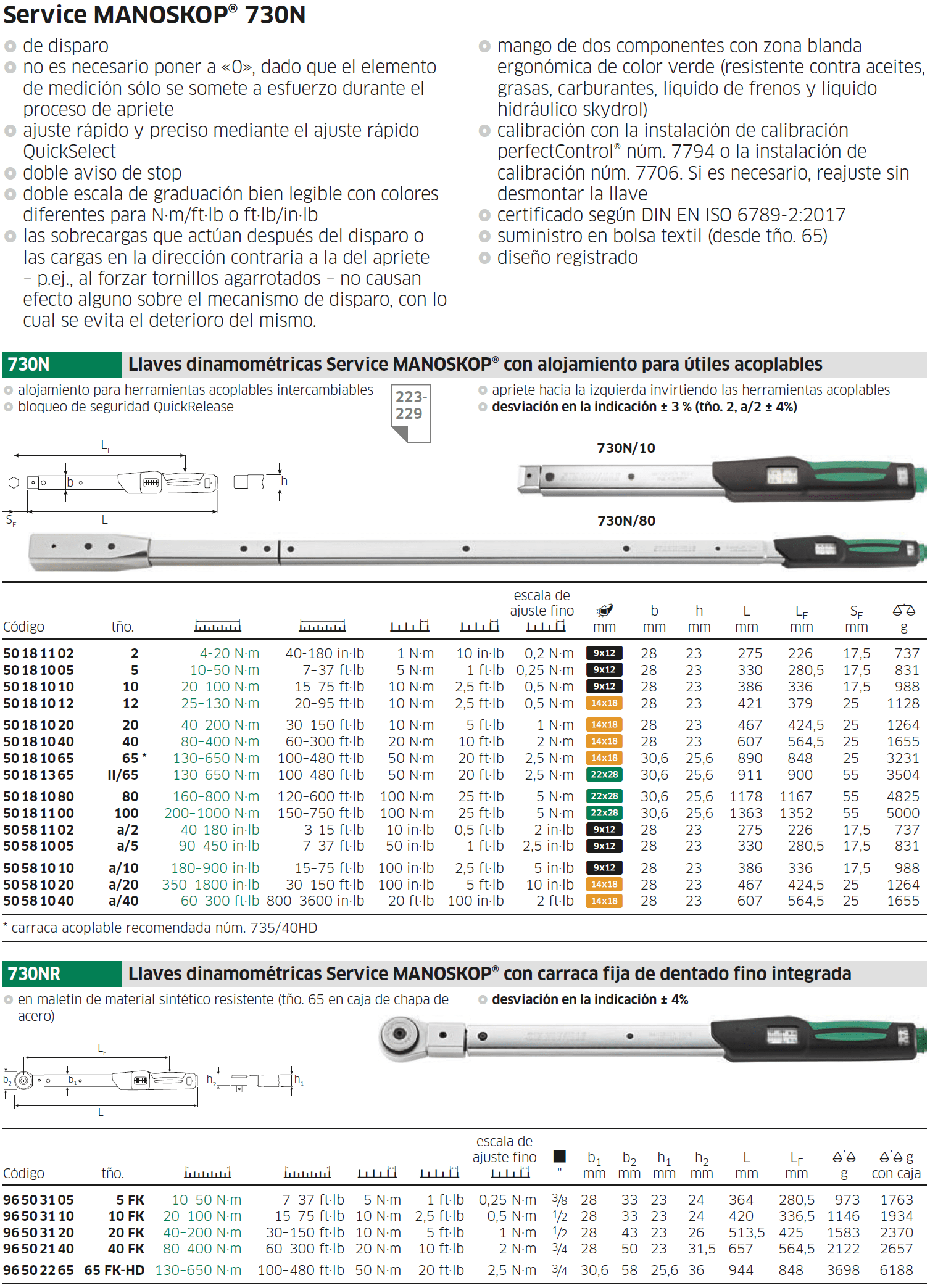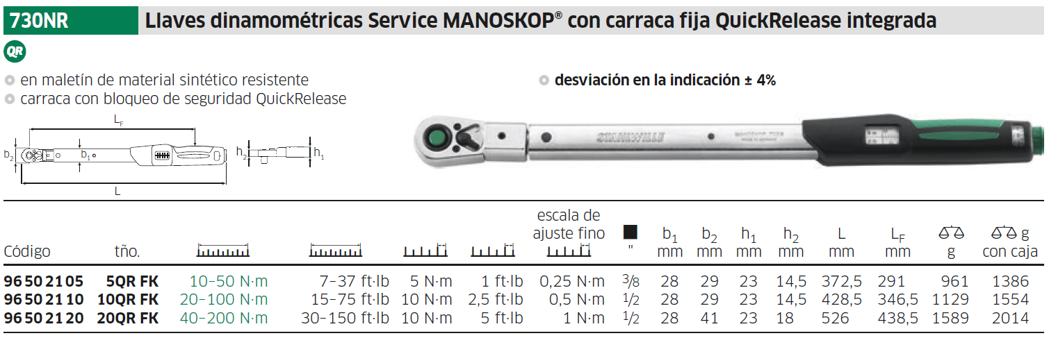La llave dinamométrica mecánica MANOSKOP® 730N destaca por su rango de medición extremadamente amplio, para aplicaciones precisas de hasta 1000 N·m. Su tecnología QuickSelect permite un ajuste especialmente sencillo, a la vez que preciso.Basta con desbloquear el botón de ajuste del extremo de la empuñadura, ajustar la herramienta, y volver a bloquearlo. El enclavamiento audible y perceptible, junto con el anillo graduado, facilitan un ajuste de precisión.
