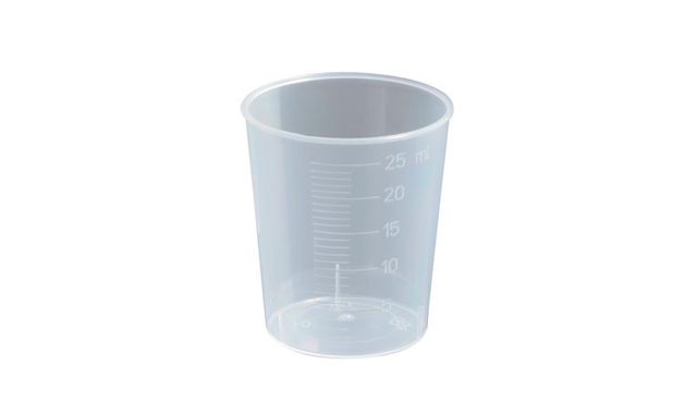 - Vaso en polipropileno y tapa en polietileno natural, graduado hasta 25 ml.